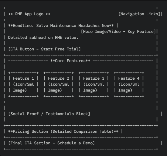 Contoh prompt : Create 3 alternative wireframes for a responsive landing page for a RME app. Provide the layouts in text + simple ASCII diagram format.